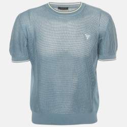 Prada Slate Blue Logo Embroidered Open Knit T-Shirt S