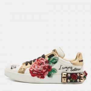 Pre Owned Dolce and Gabbana White/Black Leather Portofin Embellished Low Top Sneakers Size 35.5