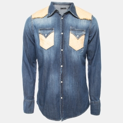 Dsquared2 Blue Washed Denim Raphia Trimmed Button Front Full Sleeve Shirt L