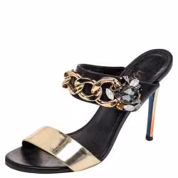 Loriblu Black/Gold Leather Embellished Chain Detail Slide Sandals Size 37.5