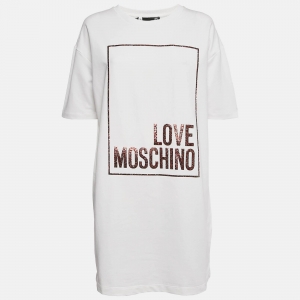 Love Moschino White Logo Embellished Cotton Knit Mini Dress M