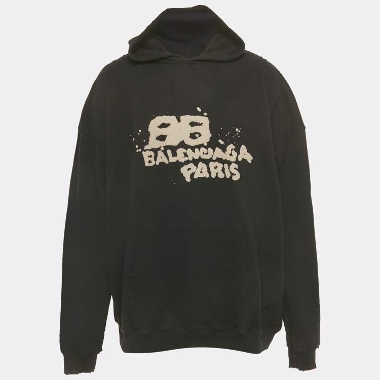 Balenciaga Black Printed Cotton Distressed Hoodie M