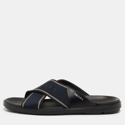 Prada Blue/Black Leather and Fabric Logo Tape Crisscross Slide Sandals Size 42