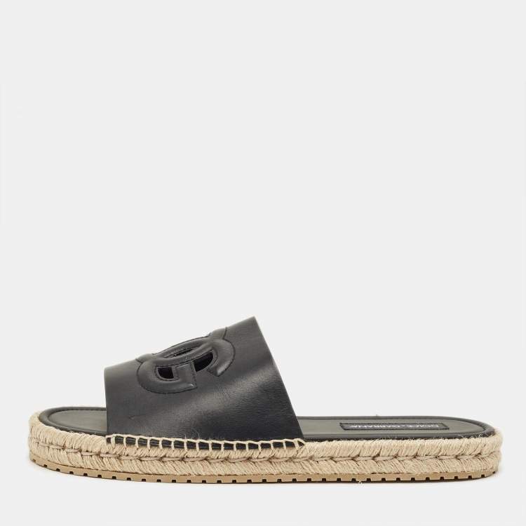 Dolce & Gabbana Black Leather Espadrille Flat Slides Size 45