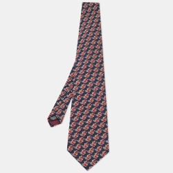 Hermes Navy Blue/Red Horsebit Patterned Silk Traditional Tie