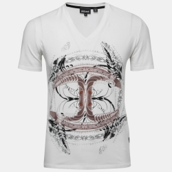 Just Cavalli White Graphic Logo Print Cotton V-Neck T-Shirt M