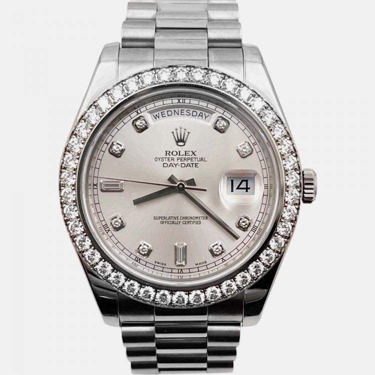 Pre Owned Rolex Day Date II 218349 Automatic White diamonds 18k White Gold Men's Wristwatch 41 mm