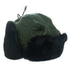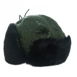 Etro Dark Green Leather and Rabbit Fur Aviator Hat L