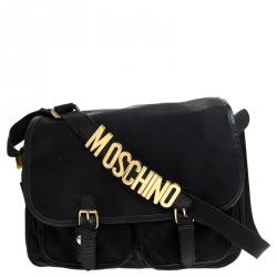 Moschino Black Logo Print Nylon and Leather Bucket Bag