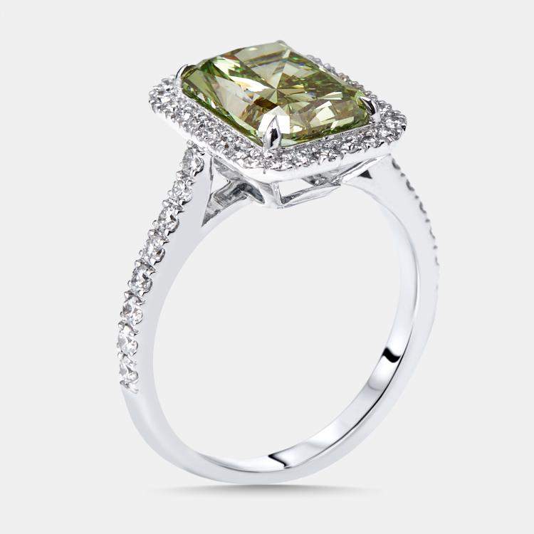 3.5 cts Green Emerald Cut, Round Lab Grown Diamonds 18k White Gold Ring Size 52