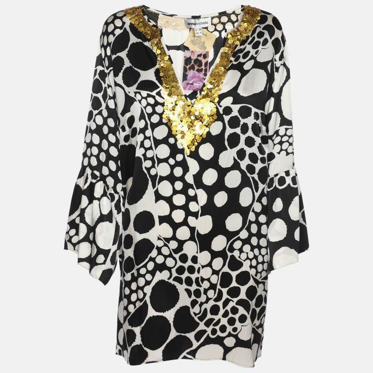 Anna Scholz Black/White Printed Satin Silk Sequin Kaftan XL
