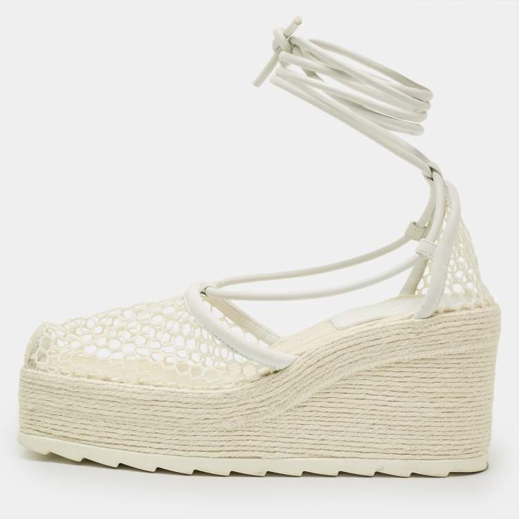 Bottega Veneta White Mesh and Leather Sporty Web Wedge Espadrille Sandals Size 39