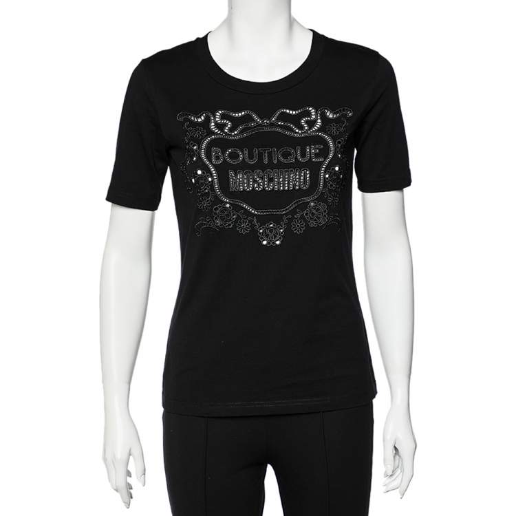 Pre Owned Boutique Moschino Black Cutwork Logo Detail Cotton Crewneck T-Shirt S