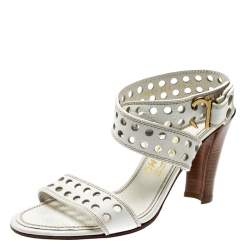 Salvatore Ferragamo White Perforated Leather Ankle Wrap Sandals Size 38