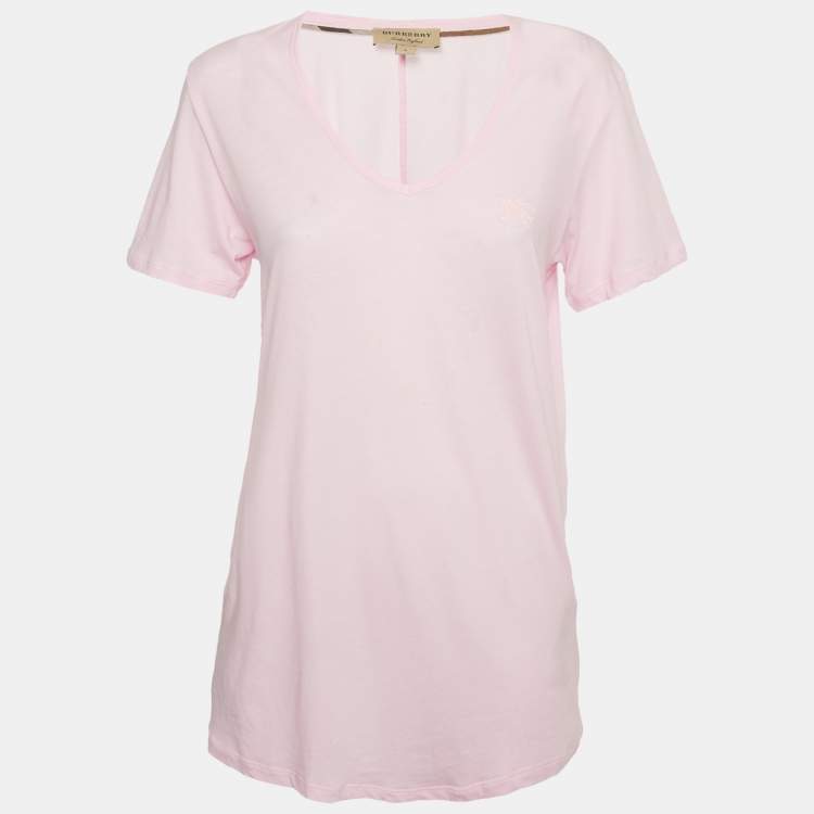 Pre Owned Burberry Pink Logo Embroidered Cotton V-Neck T-Shirt L