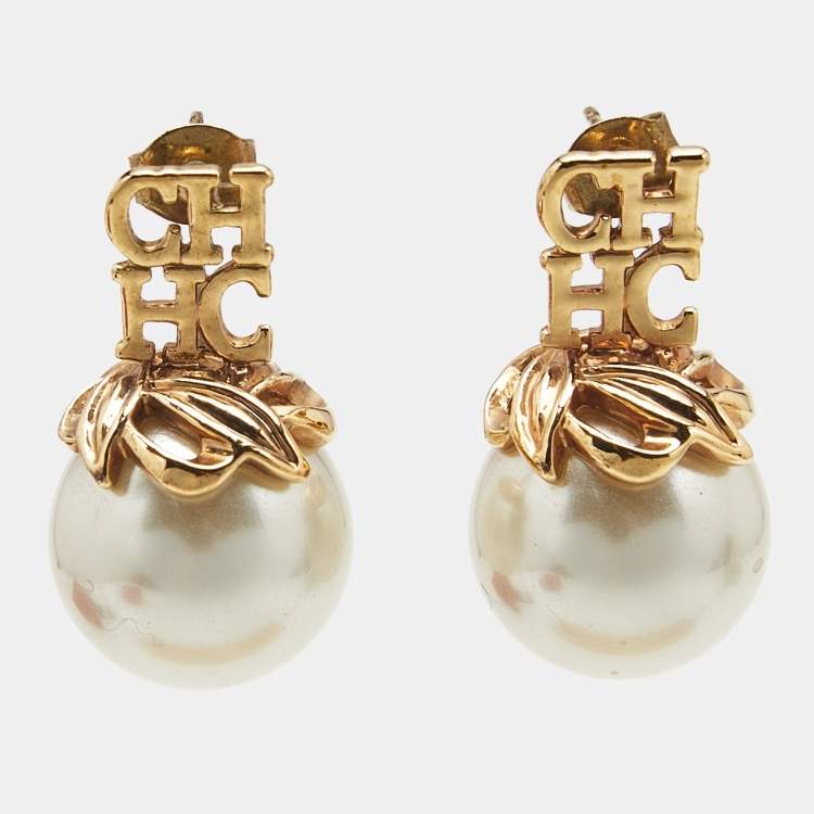 Carolina Herrera CH Faux Pearl Gold Tone Earrings