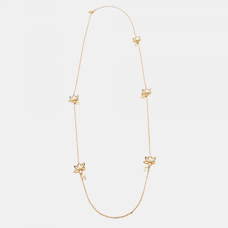Carolina Herrera CH Floral Faux Pearl Gold Tone Long Necklace