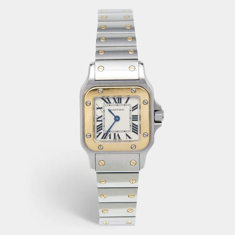 Pre Owned Cartier Cream 18k Yellow Gold Stainless Steel Santos de Cartier Galbée 3887 Women's Wristwatch 24 mm