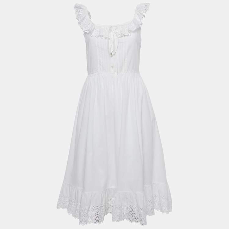 Pre Owned Celine White Cotton Floral Eyelet Frill Detail Midi Dress S