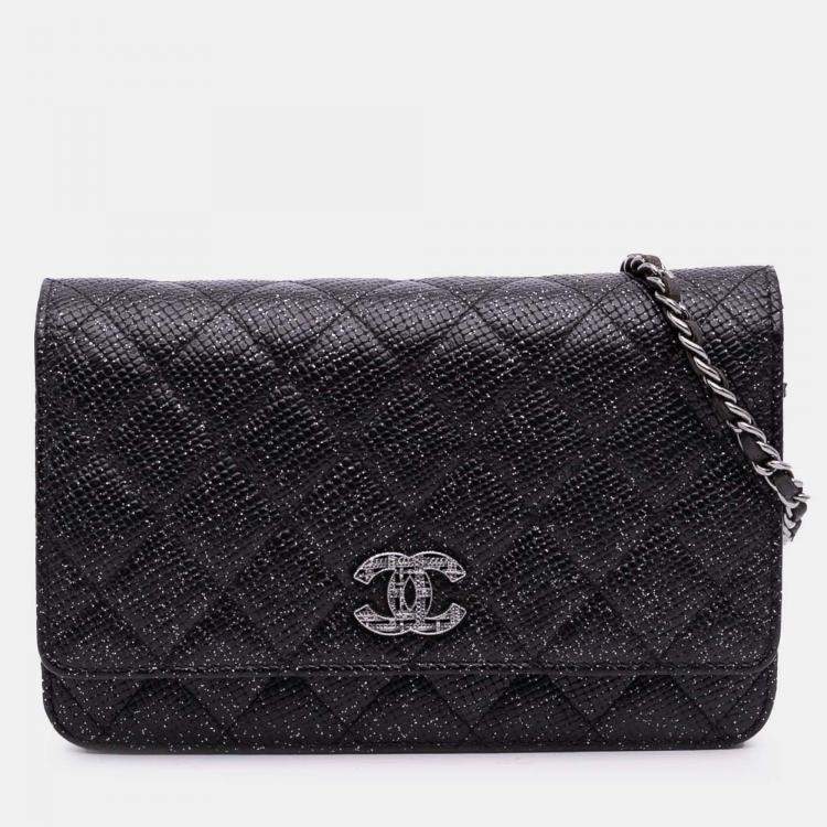 Chanel Black CC Quilted Glittered Calfskin Wallet On Chain