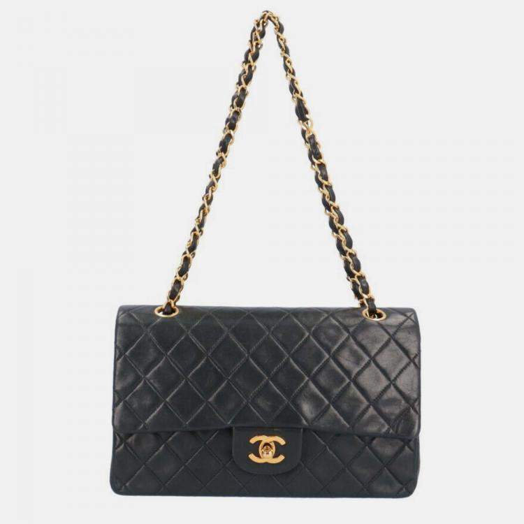 Pre Owned Chanel Black Lambskin Leather Medium Classic Double Flap Shoulder Bags