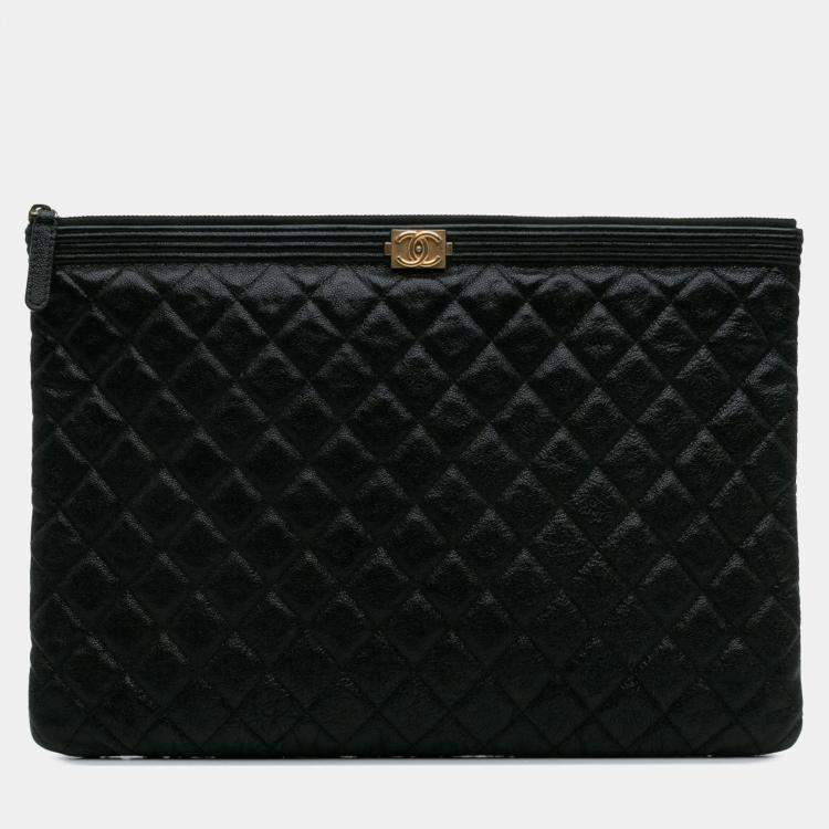 Pre Owned Chanel Black Large Lambskin Boy O Case Clutch