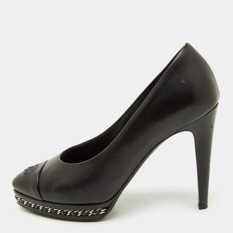 Pre Owned Chanel Black Leather CC Cap Toe Chain Detail Platform Pumps Size 38
