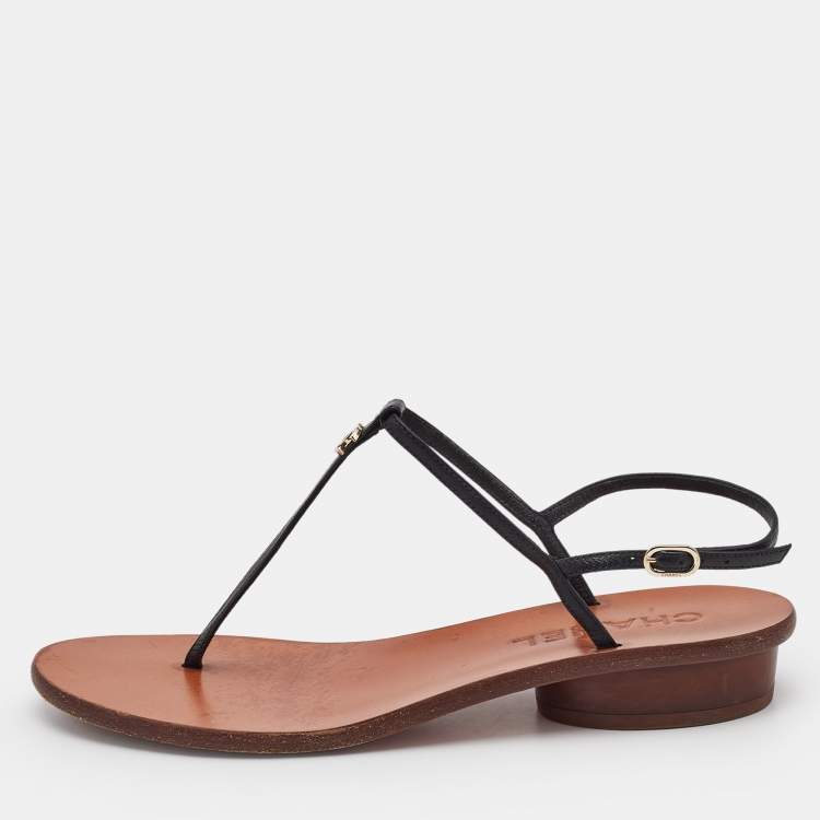 Pre Owned Chanel Black Leather T-Strap Flat Thong Sandals Size 37