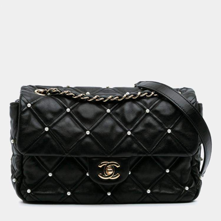 Pre Owned Chanel Black Medium Quilted Lambskin Pearl Studs Flap