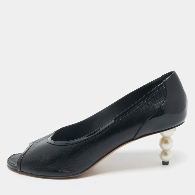 Pre Owned Chanel Black Patent and Leather CC Faux Pearl Peep Toe Pumps Size 40