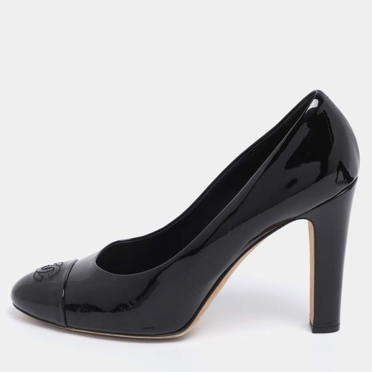 Pre Owned Chanel Black Patent Leather CC Cap Toe Pumps Size 42