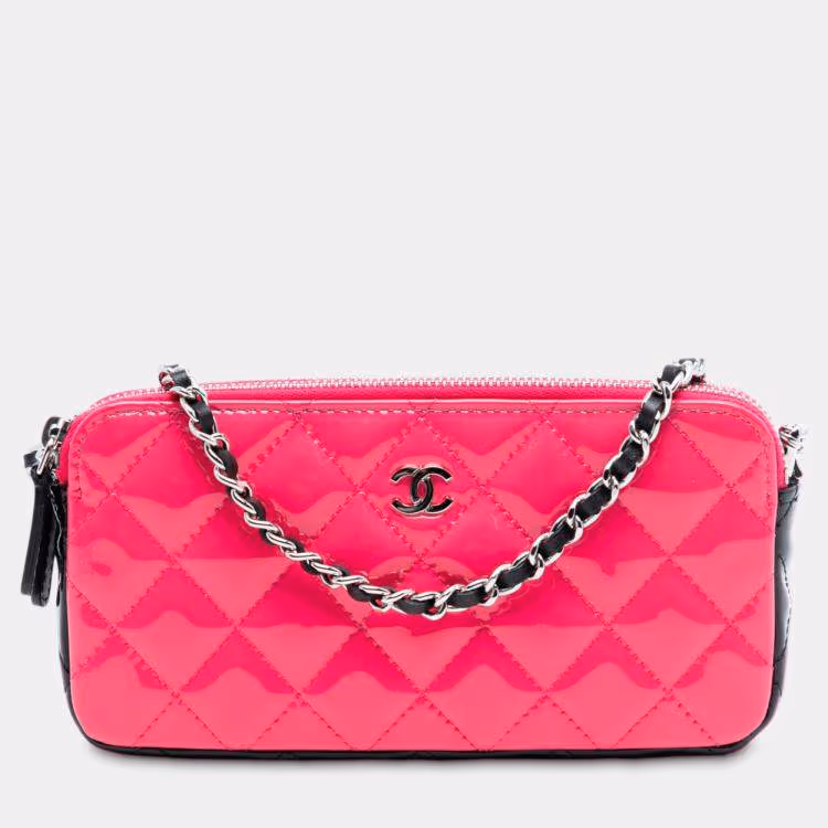 Chanel Black Pink Bicolor Patent Double Zip Wallet on Chain