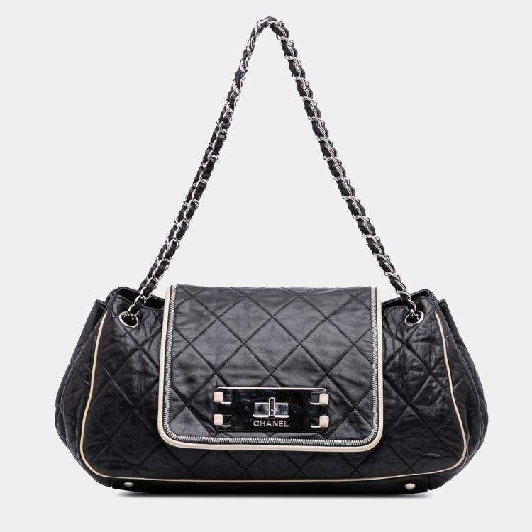 Pre Owned Chanel Black White Quilted Lambskin East West Accordion Flap