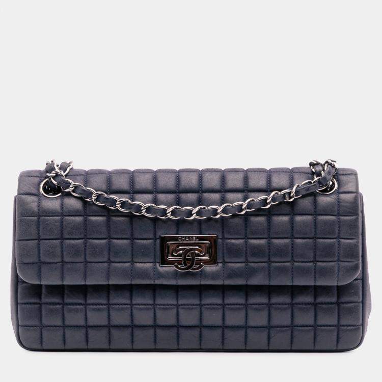 Pre Owned Chanel Blue Chocolate Bar Iridescent Calfskin Bubble Flap