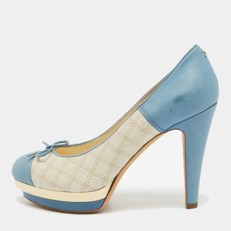 Pre Owned Chanel Blue/Cream Leather and Canvas CC Cap Toe Pumps  Size 38