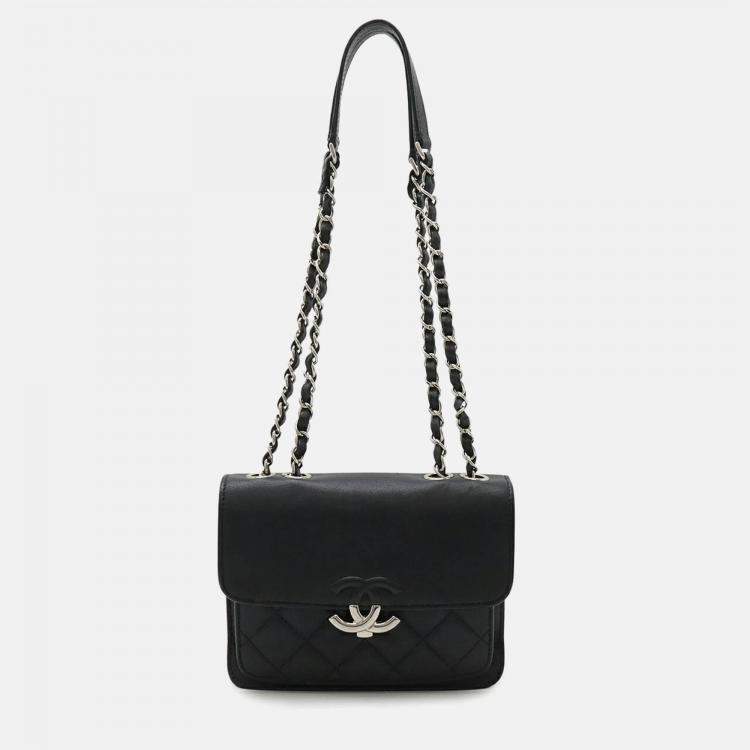 Pre Owned Chanel Half Coco Mark Double Chain Black Leather Shoulder Bag