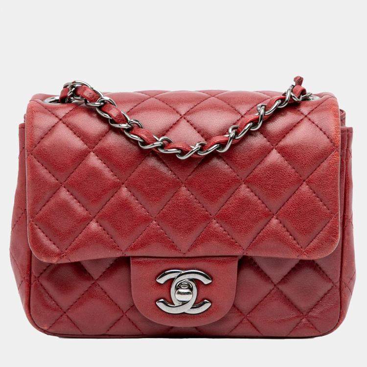 Pre Owned Chanel Red Mini Square Classic Lambskin Single Flap