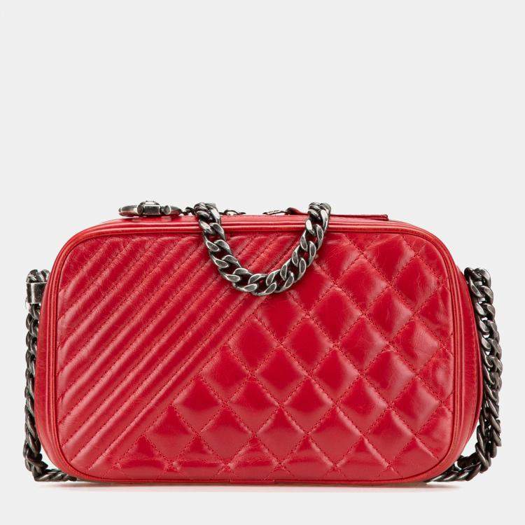Pre Owned Chanel Red Small Quilted Glazed Calfskin Coco Boy Camera Bag