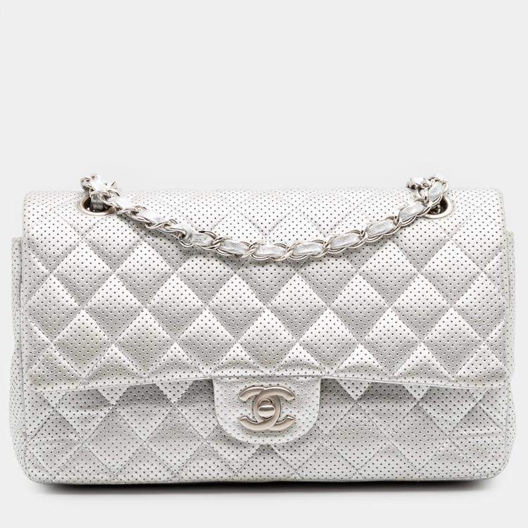 Pre Owned Chanel Silver Medium Classic Perforated Lambskin Double Flap