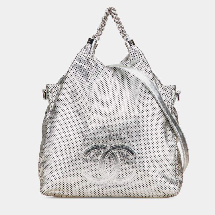 Pre Owned Chanel Silver Medium Metallic Glazed Calfskin Perforated Rodeo Drive Satchel