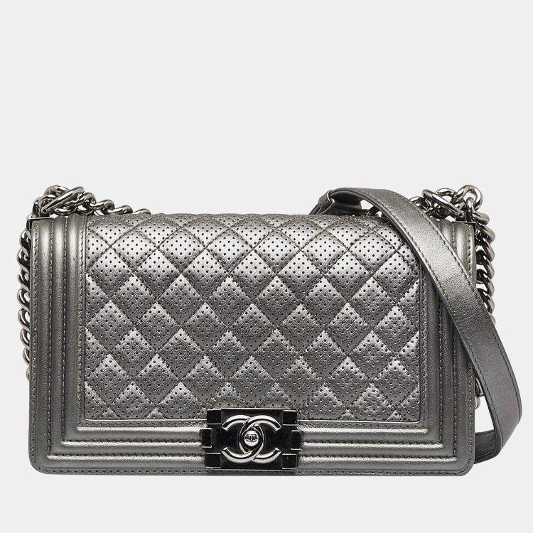 Pre Owned Chanel Silver Medium Perforated Lambskin Boy Flap