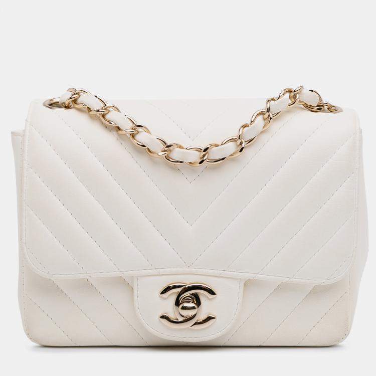 Chanel White Mini Square Classic Chevron Lambskin Single Flap