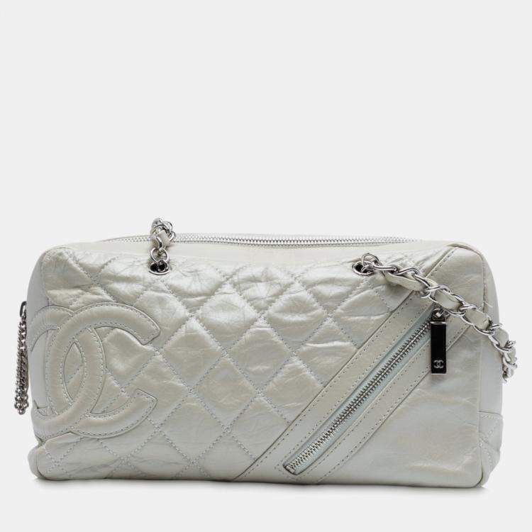 Pre Owned Chanel White Quilted Aged Calfskin Cotton Club Bowler Bag