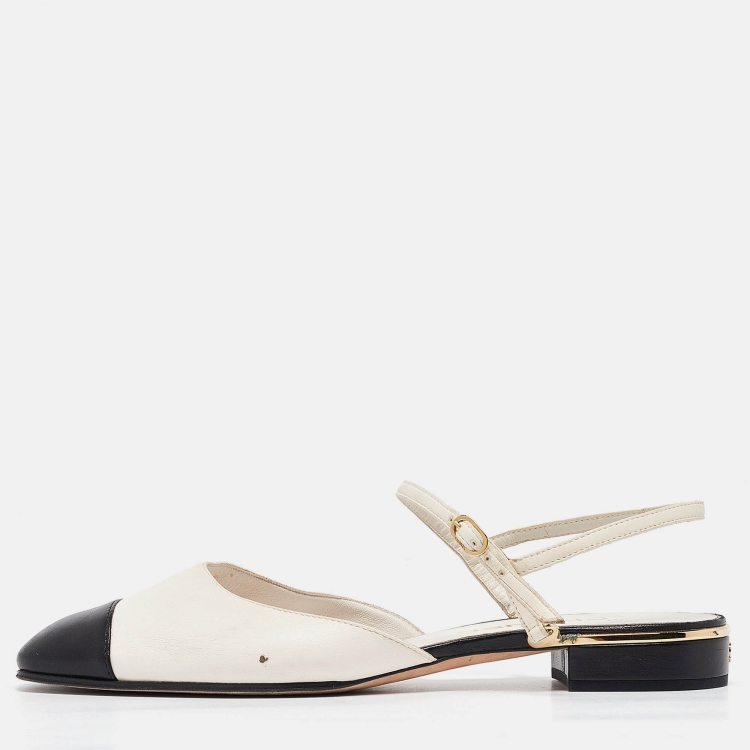 Pre Owned Chanel White/Black Leather CC Cap Toe Ankle Strap Flats Size 40.5