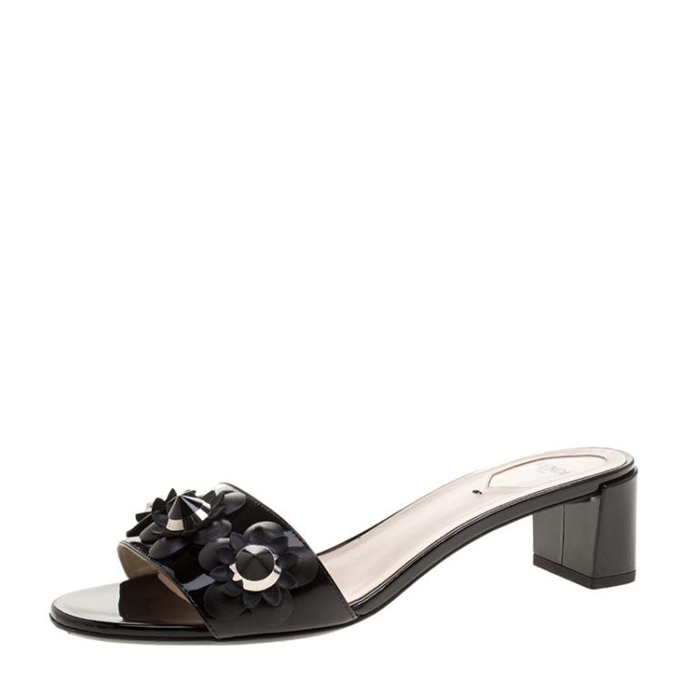 Pre Owned Fendi Black Patent Leather Floral Appliquè Slide Mules Size 40