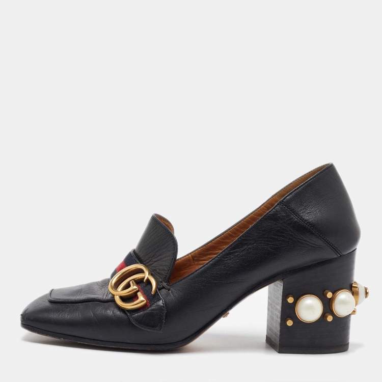 Pre Owned Gucci Black Leather Web GG Marmont Faux Pearl Block Heel Loafer Pumps Size 38