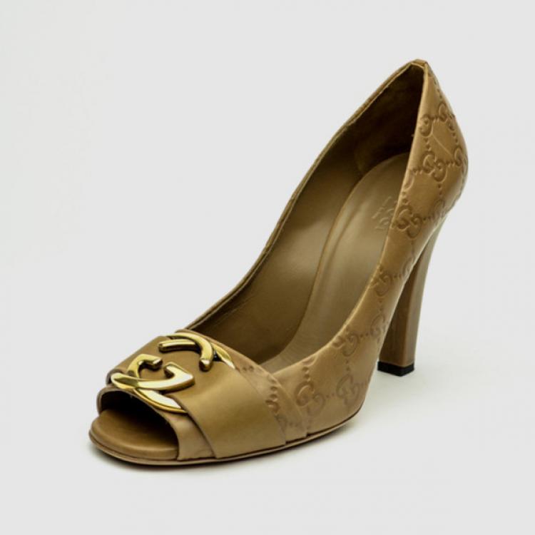 Gucci GG Logo Stamped Guccissima Caramel Leather Open Toe Pumps Size 38.5