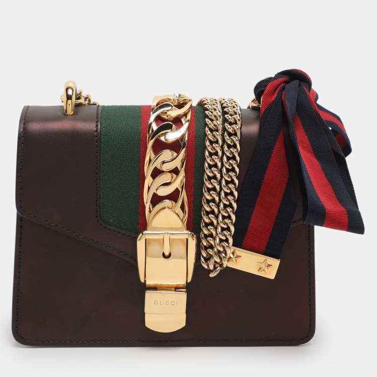 Pre Owned Gucci Metallic Black Leather Mini Web Chain Sylvie Crossbody Bag
