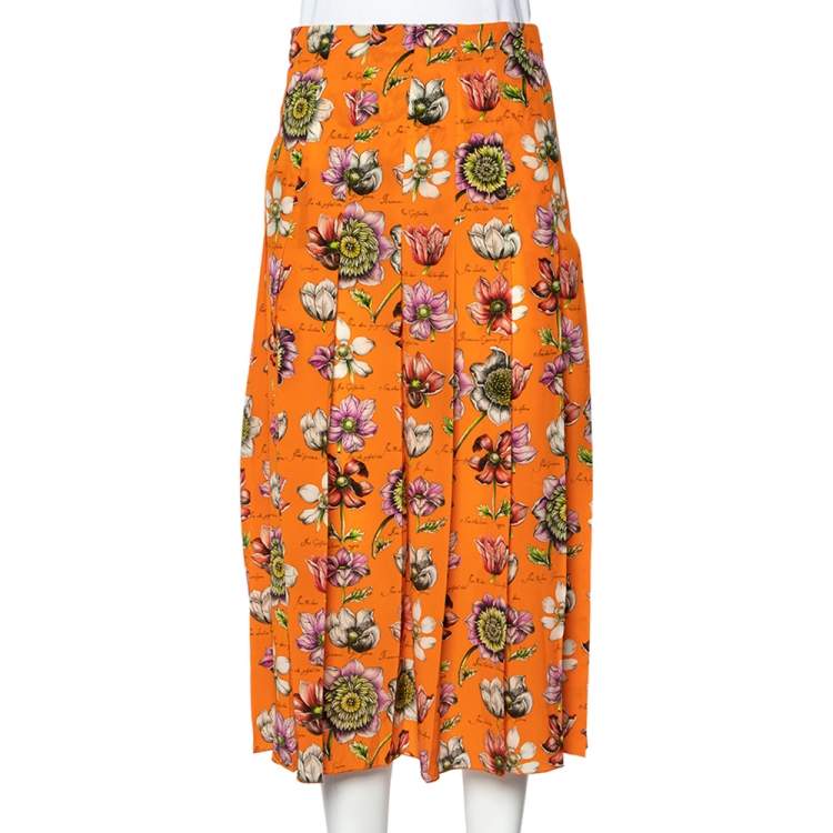 Gucci Orange Floral Printed Silk Pleated Midi Skirt S