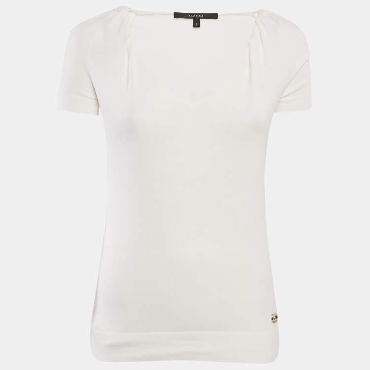 Pre Owned Gucci White Cotton Knit GG Logo Detail V-Neck T-Shirt S